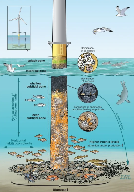 Recent research into the effects of windfarms on marine ecosystems discusses how the foundational bases of offshore wind turbines can serve as artificial reef habitats that provide shelter and feeding grounds for fish. Monopile, jacket, and gravity- based turbine foundations hold potential as nature-based solutions that produce renewable energy while simultaneously conserving marine life, enhancing fisheries.